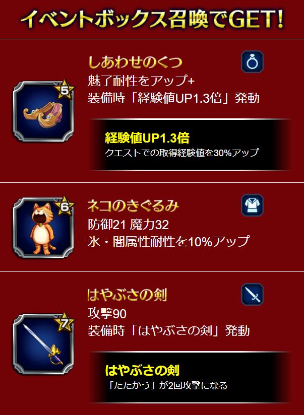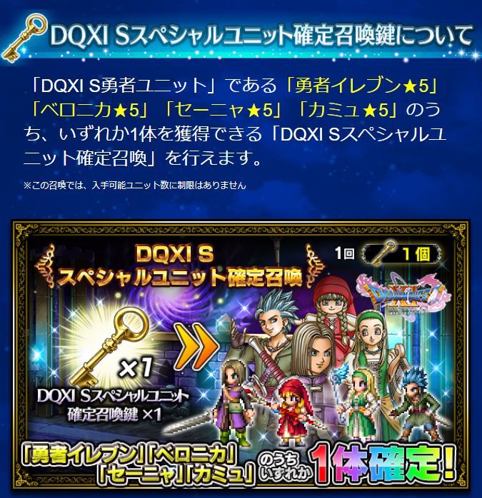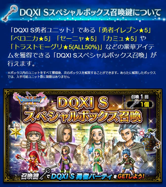 また1ボックス目・4ボックス目にはなんと、それぞれキーアイテムとして「DQXI Sスペシャルボックス召喚鍵」「DQXI Sスペシャルユニット確定召喚鍵」が登場します!勇者ユニットたちを仲間にできるこの機会に、ぜひイベントをお楽しみください。