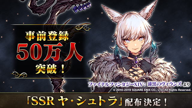 この度、『FFBE 幻影戦争』の事前登録数が50 万人を突破したため、ゲーム配信時に「SSR ヤ・シュトラ(ファイナルファンタジーXIV: 漆黒のヴィランズ)」のプレゼントが決定いたしました。
