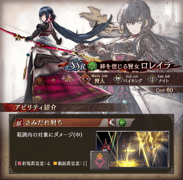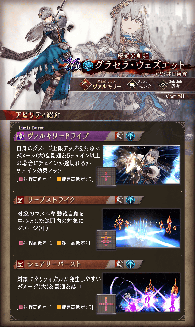 グラセラ・ウェズエットのメインジョブは新たなジョブ「ヴァルキリー」で登場いたします。ヴァルキリーは前衛の物理アタッカータイプで、前方2マスへの貫通攻撃が可能な槍を使って十字3マス範囲やクロス範囲への攻撃アビリティを行うなど広範囲への攻撃が可能なジョブとなっています。