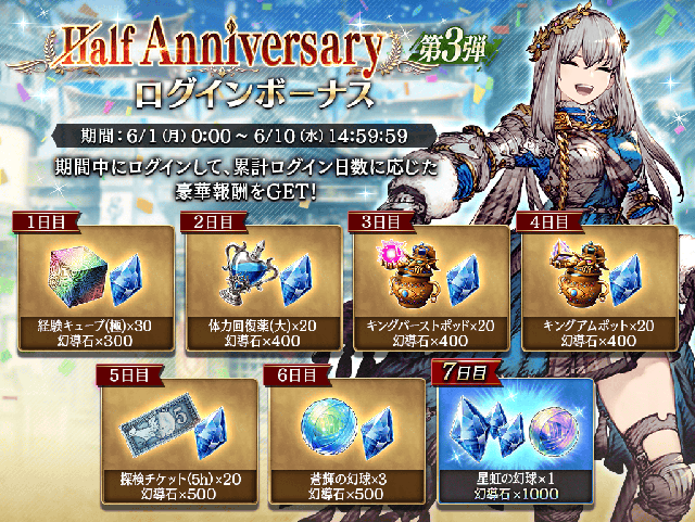 期間中にログインすることで、累計ログイン日数に応じた豪華報酬が手に入ります。新ユニット「グラセラ・ウェズエットの欠片」や「星虹の幻球」や「虹の想いの欠片」など、各種覚醒素材をはじめとしたアイテムがログインをするだけで入手可能となっています。期間中ログインをして豪華報酬を手に入れましょう。