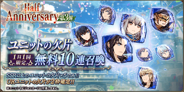 Half Anniversary 第3弾キャンペーンとして、1日1回限定でSSR以上のユニットの欠片が手に入る無料10連召喚を開催いたします。こちらの召喚ではURユニットの欠片×5が2枠確定で手に入ります。