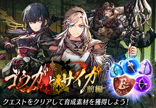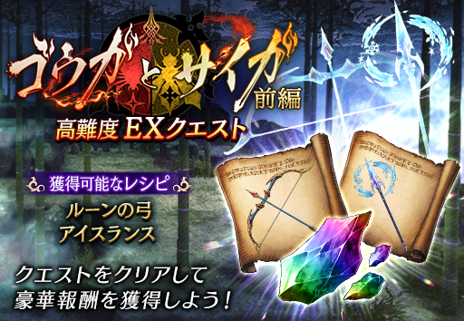 ストーリークエストで語られなかった、シノビの里「ゴウガ」と「サイガ」にまつわる物語、「ゴウガとサイガ 前編」を開催いたします。クエストをクリアすることで、「ロレイラ」や「グラセラ・ウェズエット」のジョブ強化素材などが入手可能です。また、「10話 不死身のザザン」をクリアすることで出現する高難度EXクエストでは、SSR武器「ルーンの弓(弓)」や「アイスランス(槍)」のクラフトレシピやクラフト素材を入手することができます。