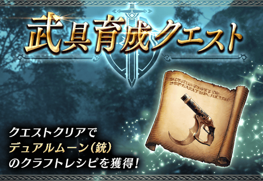 7月1日(土)0時より、『武具育成クエスト』を開催いたします。クエストをクリアすることで、SSR武具『デュアルムーン(銃)』のクラフトレシピが獲得できるほか、クラフトや覚醒に必要な素材が手に入ります。さらに、難易度の高い『超高難度 武具育成クエスト』では、より多くのクラフトレシピや覚醒素材が獲得できます。