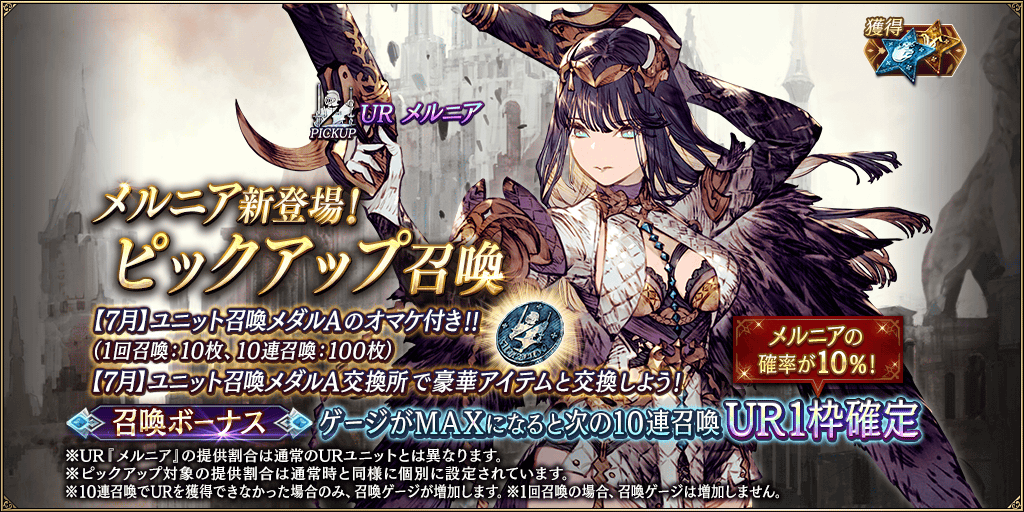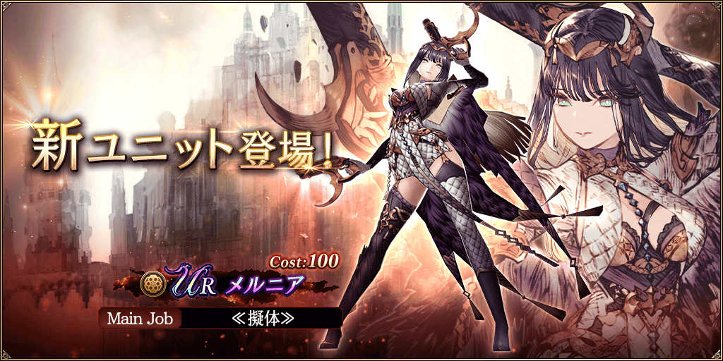 7月1日(土)0時より、新URユニット『メルニア』が登場いたします。併せて、『メルニア』が手に入りやすくなるピックアップ召喚を開催いたします。