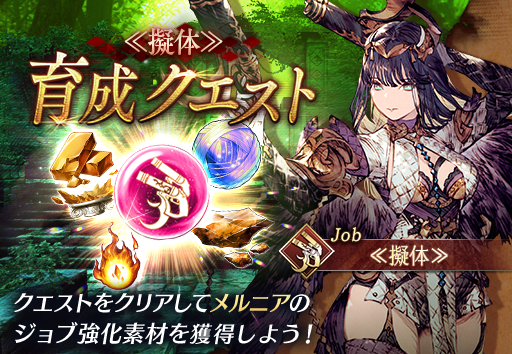 7月1日(土)0時より、『≪擬体≫育成クエスト』を開催いたします。クエストミッションを達成することで、新登場ユニット『メルニア』のジョブ『≪擬体≫』の強化素材を獲得できます。さらに、ドロップアイテムとして『想いの欠片』や『覚醒輝源』などの獲得が可能です。さらに今回、期間中にゲーム内で様々な条件を満たすことで限定称号などの報酬を獲得可能です。