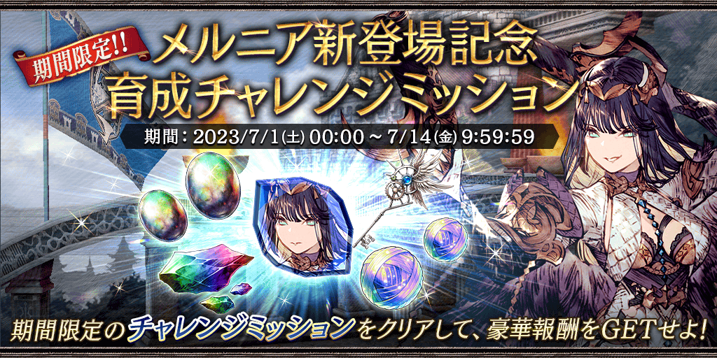 7月1日(土)0時より、URユニット『メルニア』の新登場を記念して、期間限定の育成チャレンジミッションを開催いたします。ミッションをクリアすることで、さまざまな報酬が獲得できます。