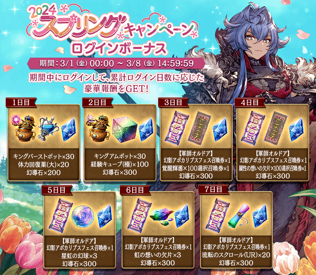 3月1日(金)0時より、『FFBE幻影戦争』2024スプリングキャンペーンとして「【軍師オルドア】幻影アポカリプスフェス召喚券」などがもらえる期間限定のログインボーナスを開始いたしました。この機会にぜひ豪華ログインボーナスをお受け取りください!