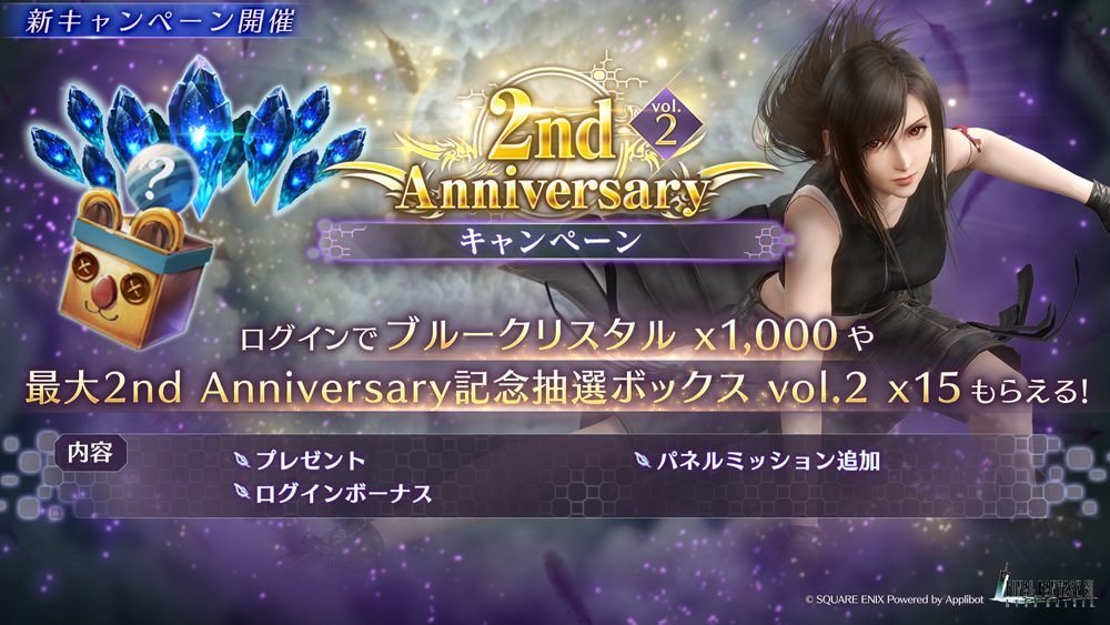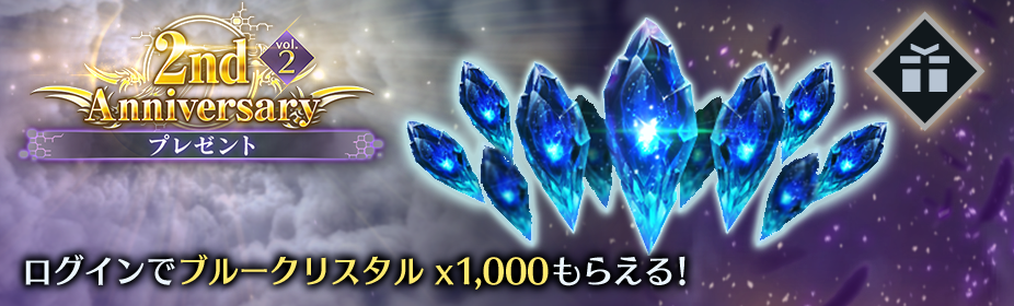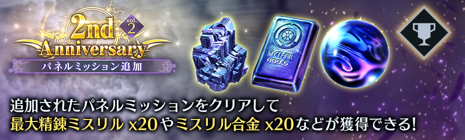 期間中のログインで最大「2nd Anniversary記念抽選ボックス vol.2」×15や「ブルークリスタル」×1,000の獲得が可能です。また期間中に追加されたパネルミッションをクリアすることで精錬ミスリル×20やミスリル合金×20などが獲得できます。