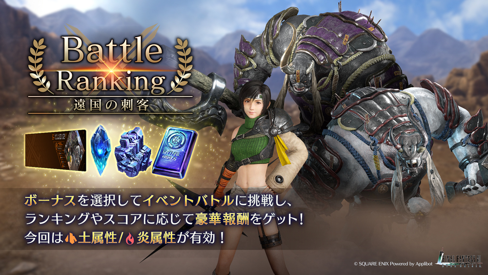 期間中、ティファ専用武器「コンバットレザーグローブ」、ユフィ専用武器「凌十字手裏剣」、セフィロス専用武器「双刃」、またセフィロス (Original)専用アルティメット武器「天の叢雲」の出現率が上昇しているガチャを開催!