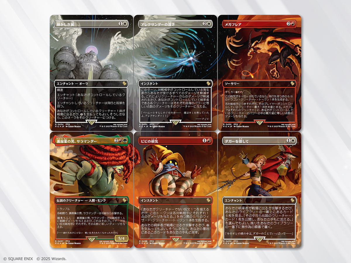 続いてご紹介するのは、『マジック:ザ・ギャザリング——FINAL FANTASY IX』 シーン・ボックス——アレクサンドリアの戦いに収められた、《輝かしき翼》、《アレクサンダーの裁き》、《メガフレア》、《裏家業の男、サラマンダー》、《ビビの根気》、《ダガーを探して》という6枚のカードです。
