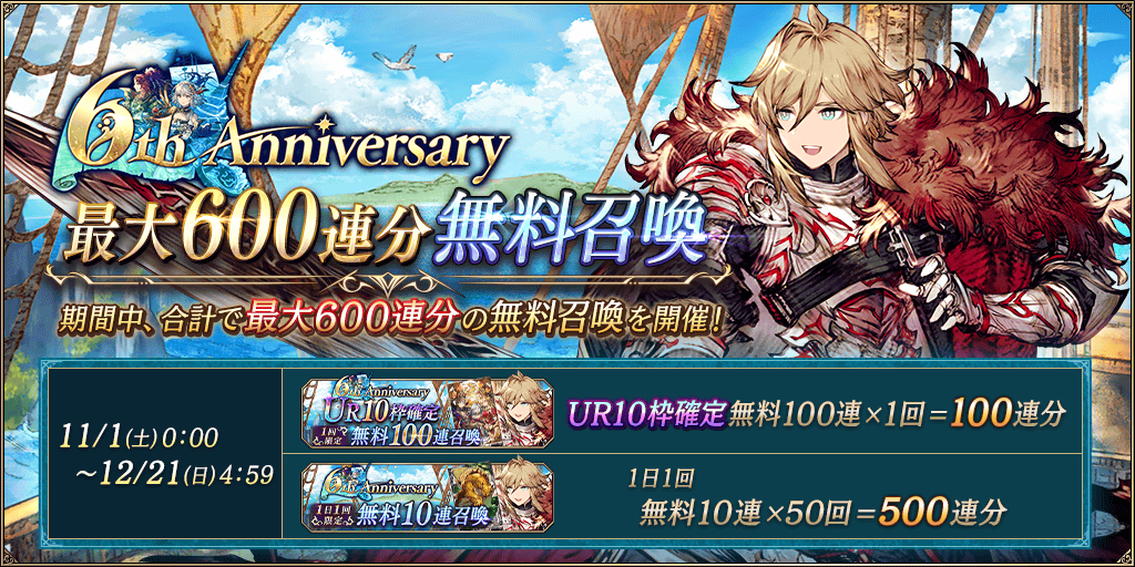 これを記念し、「6th Anniversary最大600連分無料召喚」など、豪華なキャンペーンを開催いたします。