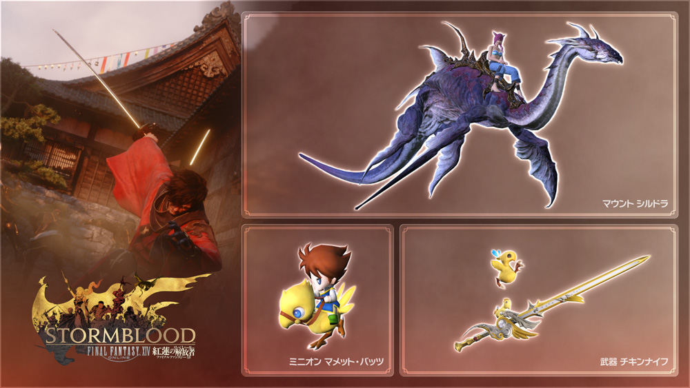 『新生エオルゼア』に加え、すべての拡張パッケージ(『蒼天のイシュガルド』&『紅蓮のリベレーター』&『漆黒のヴィランズ』&『暁月のフィナーレ』&『黄金のレガシー』)のアップグレードがセットになったお得なパッケージです。 - マウント でぶチョコボ