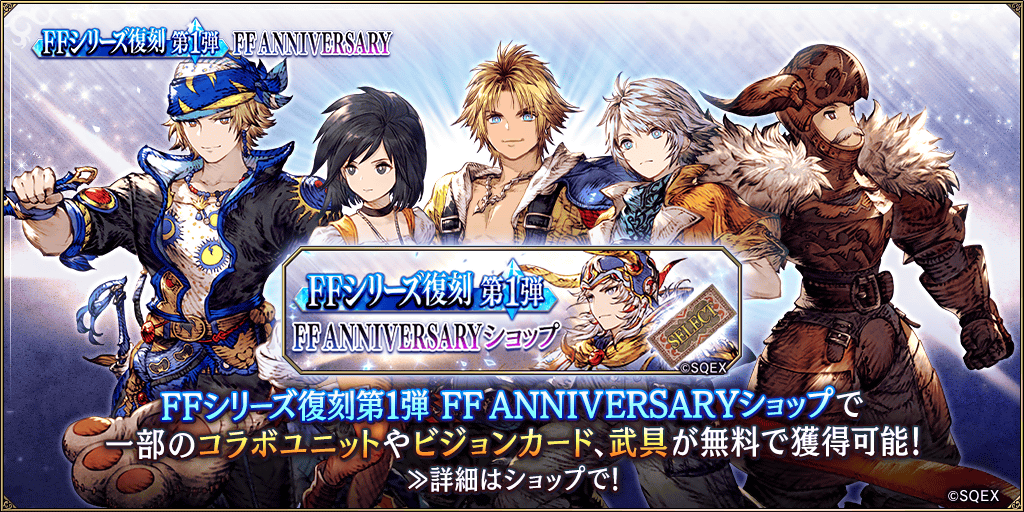 キャンペーン期間中は、第1弾の復刻対象コラボとして、過去に登場したコラボユニットやコラボビジョンカードが再登場するほか、「FFシリーズ復刻第1弾 FF ANNIVERSARYショップ」では、一部のコラボユニット6体とビジョンカード6枚などを無料で獲得できます。また、各種ピックアップ召喚などの関連キャンペーンも同時開催しております。