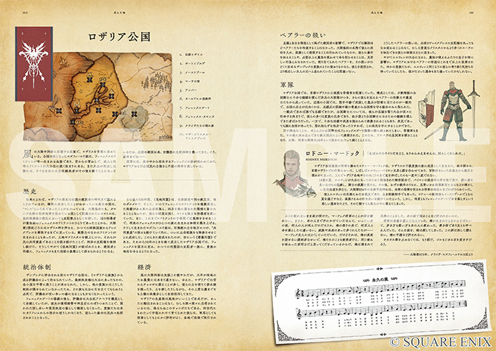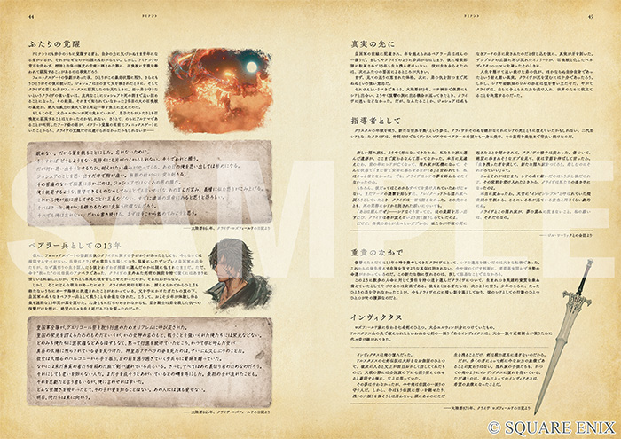 前廣:本書は世界設定をまとめた本ではあるのですが、いわゆる“事典”ではないんです。『FFXVI』には、世界の歴史や伝承に詳しい“語り部”と呼ばれるハルポクラテスというキャラクターが登場するのですが、彼が主人公であるクライヴなどの登場人物や、ヴァリスゼアと呼ばれる世界についてしたため本にしたという内容で、本書に記述されている文章は、すべてハルポクラテスが書いたものという体裁になっています。