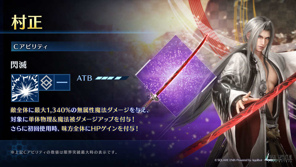 期間中、セフィロス(Original)が装備可能な新たな武器「村正」とユフィが装備可能な新たな武器「家宝の筆」の出現率が上昇しているガチャを開催!