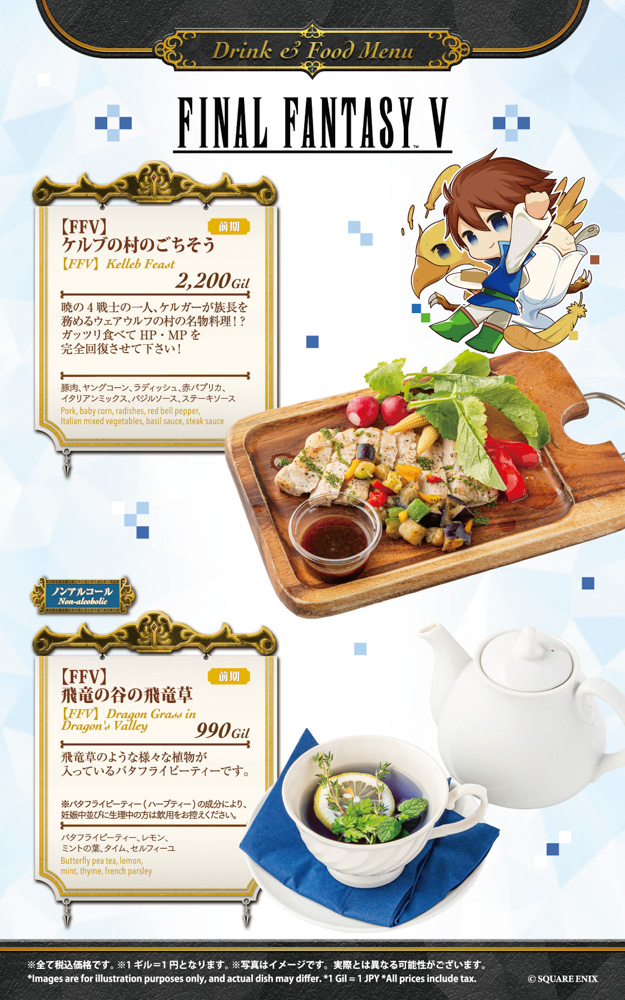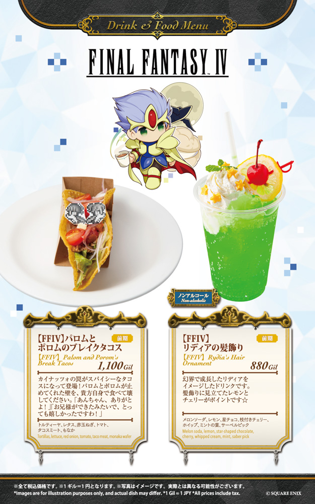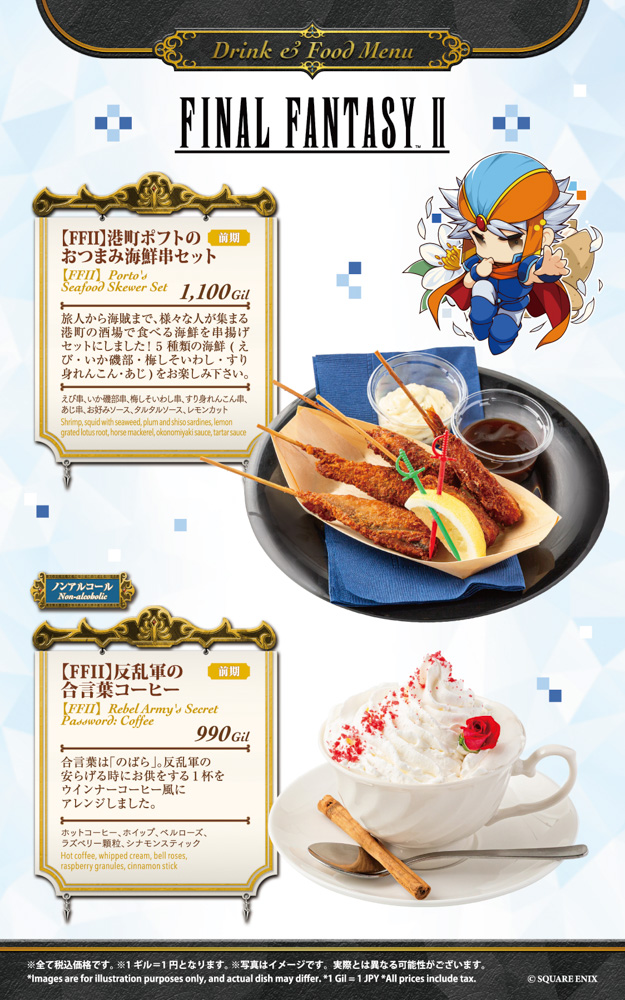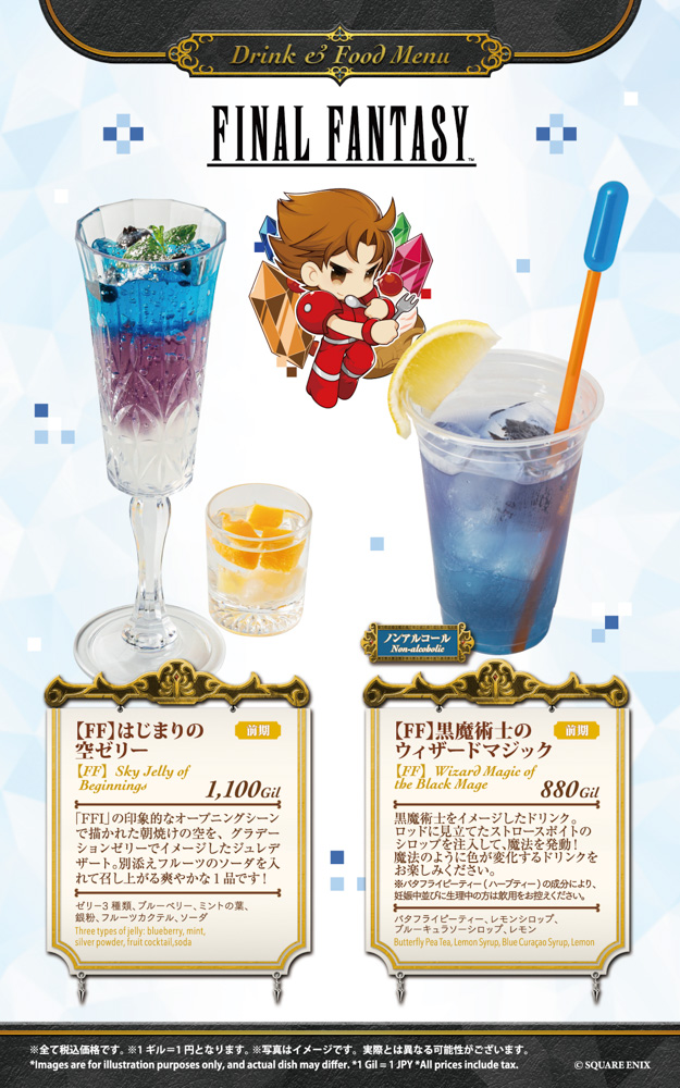 大阪は2月13日(金)~3月2日(月)を前期、3月3日(火)~3月18日(水)を後期として、そして名古屋は『ファイナルファンタジーIX』コラボ終了後の4月10日(金)~4月27日(月)を前期、4月28日(火)~5月18日(月)を後期として、それぞれフード6品、ドリンク6品を展開いたします。