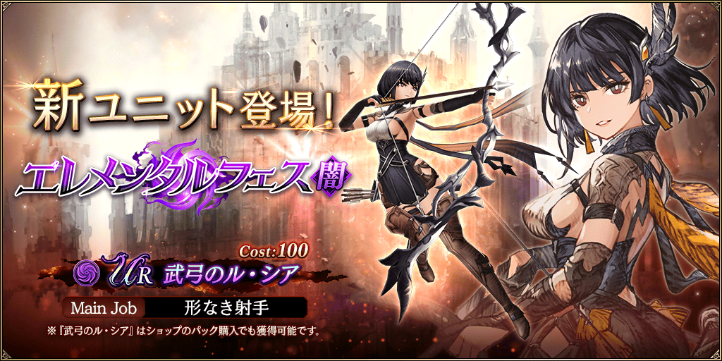 2月1日(日)より、新ユニット「武弓のル・シア」が登場いたしました。さらに、新ユニットの登場確率がUPする、ピックアップ召喚「エレメンタルフェス~闇属性~」も同日より開催致します。召喚ごとに獲得できる「【2月】エレメンタルフェス(闇)召喚メダルA」は、交換所にて豪華アイテムと交換が可能です。