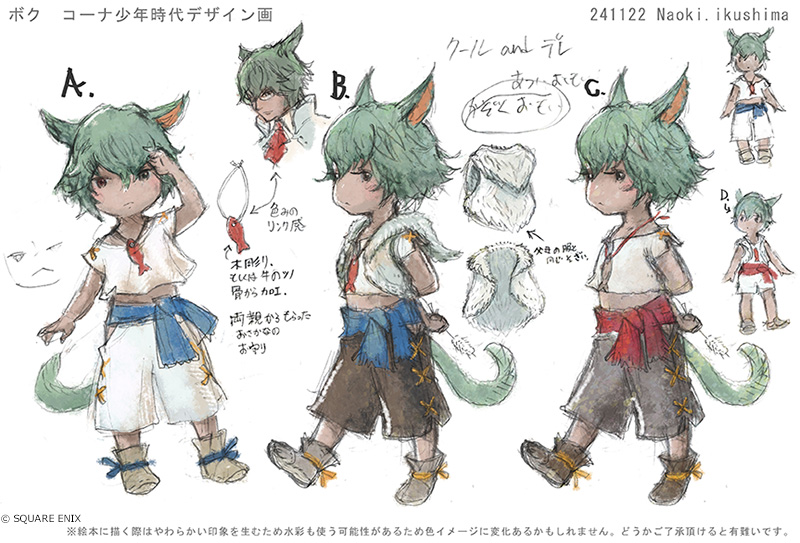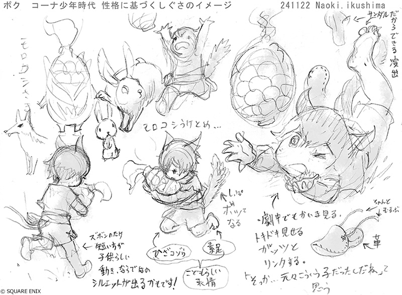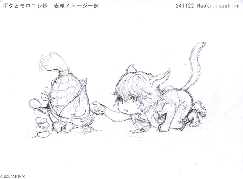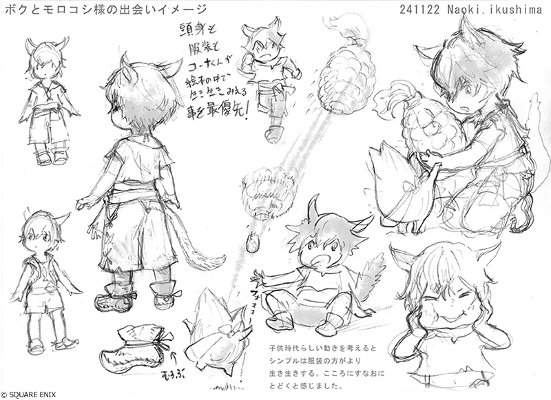 『FFXIV』で何かを作ろうとすると、設定画を描いてもらうだけじゃなくてキャラクターをモデリングしてモーションを作ってもらって…とすごいコストが発生します。ですから、「5歳くらいの男の子のミコッテがほしいです」なんて軽々しくは言えません。仮に子どものモデルを作れたとしても、その前後の年齢までは簡単には作れない。でも、絵本の場合はイラストレーターの方が頑張っていただければ世に出せるんですよ(笑)。そういう下心があって微妙な年頃のコーナ君を頼んだら、ものすごく可愛いのがあがってきて良かったなと。この姿が、この年頃のミコッテなんだと理解が深まりました。