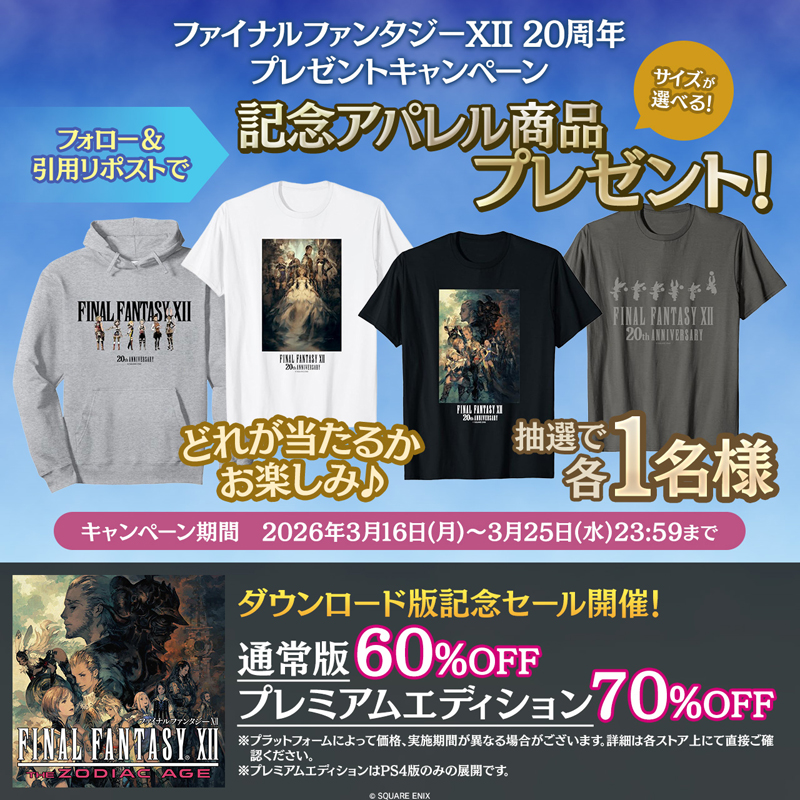 「ファイナルファンタジー」シリーズ公式Xアカウント(https://x.com/FinalFantasyJP)にて、『FFXII』の20周年を記念したプレゼントキャンペーンを実施中です。