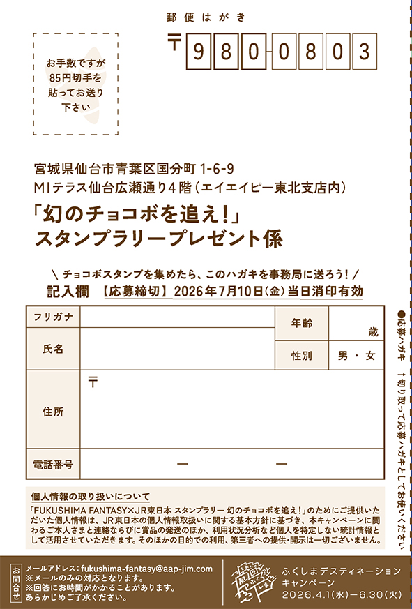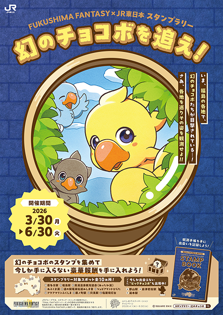 このたび、2026年4月~6月に福島県全域を舞台に開催される「ふくしまデスティネーションキャンペーン(以下、ふくしまDC)」に合わせ、現地周遊企画「FUKUSHIMA FANTASY×JR 東日本 スタンプラリー 幻のチョコボを追え!」を実施します。