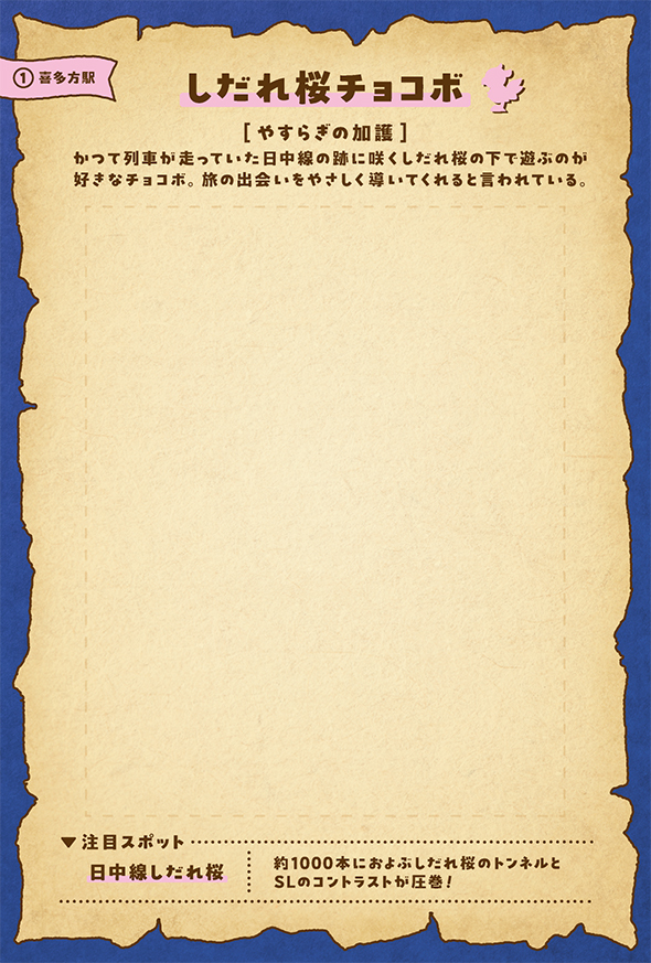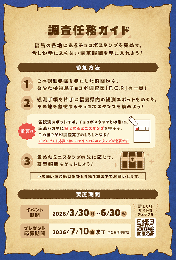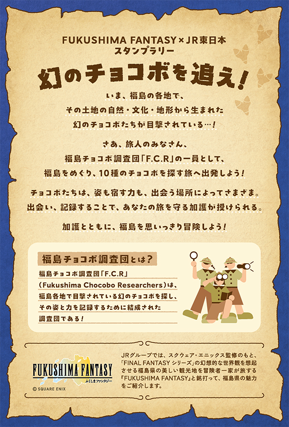 「福島県内10箇所の観光地に“未確認チョコボ”が現れる」というストーリーのもと、参加者は「チョコボ調査団 F.C.R(Fukushima Chocobo Researchers)」の調査員となり、各地を巡って“観測”していく体験型スタンプラリーです。