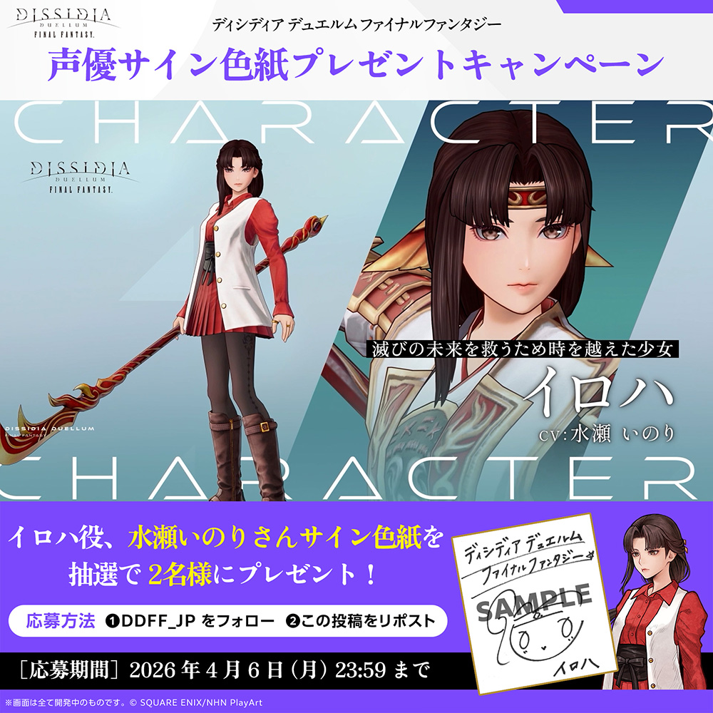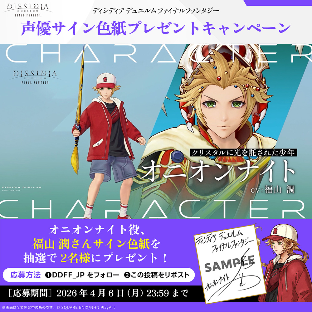 キャラクター参戦を記念して、出演声優様のサイン色紙が当たるプレゼントキャンペーンを開催!『ディシディア デュエルム ファイナルファンタジー』公式Xアカウント(@DDFF_JP)をフォローして、応募期間までに対象の投稿をリポストした方の中から抽選で、オニオンナイト役の福山潤さん、イロハ役の水瀬いのりさんのサイン色紙を各2名様にプレゼントいたします。