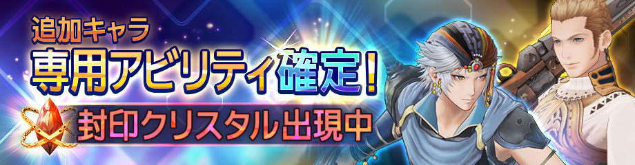 イベント期間中、シーズンランクバトルとカジュアルバトルの勝利報酬にて、ランダムで特別な封印クリスタルが登場します。この特別な封印クリスタルが解放されると、「フリオニール」「バルフレア」のSR以上の専用アビリティが確定で出現。「フリオニール」「バルフレア」専用URアビリティの出現確率は25%になります。さらに、期間中毎日1バトルを行うことで獲得できるイベントミッション報酬でも、特別な封印クリスタルを入手することができます。ぜひこの機会にお楽しみください。