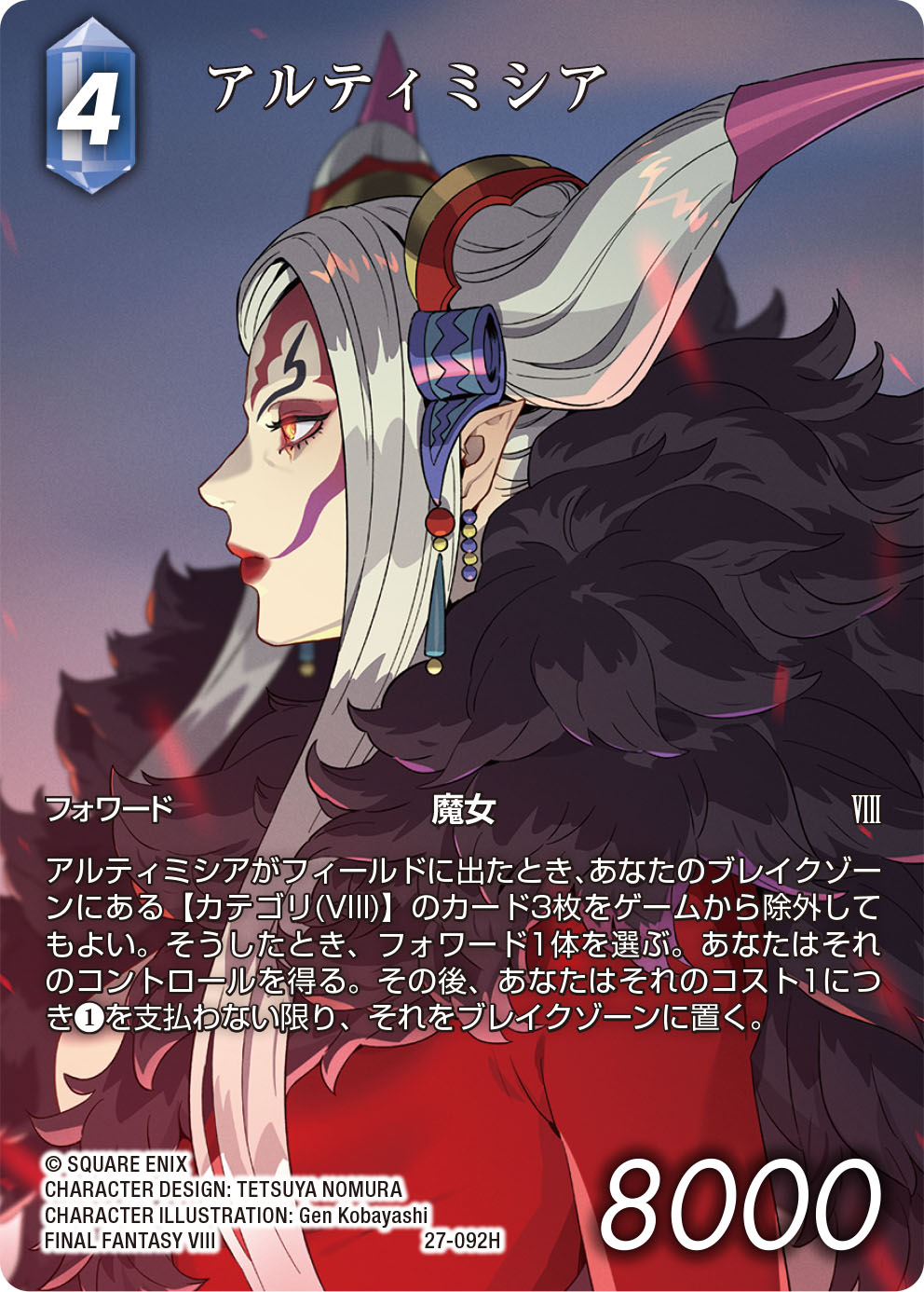 『アルティミシアがフィールドに出たとき、あなたのブレイクゾーンにある【カテゴリ(VIII)】のカード3枚をゲームから除外してもよい。そうしたとき、フォワード1体を選ぶ。あなたはそれのコントロールを得る。その後、あなたはそれのコスト1につき1CPを支払わない限り、それをブレイクゾーンに置く。』というものです。
