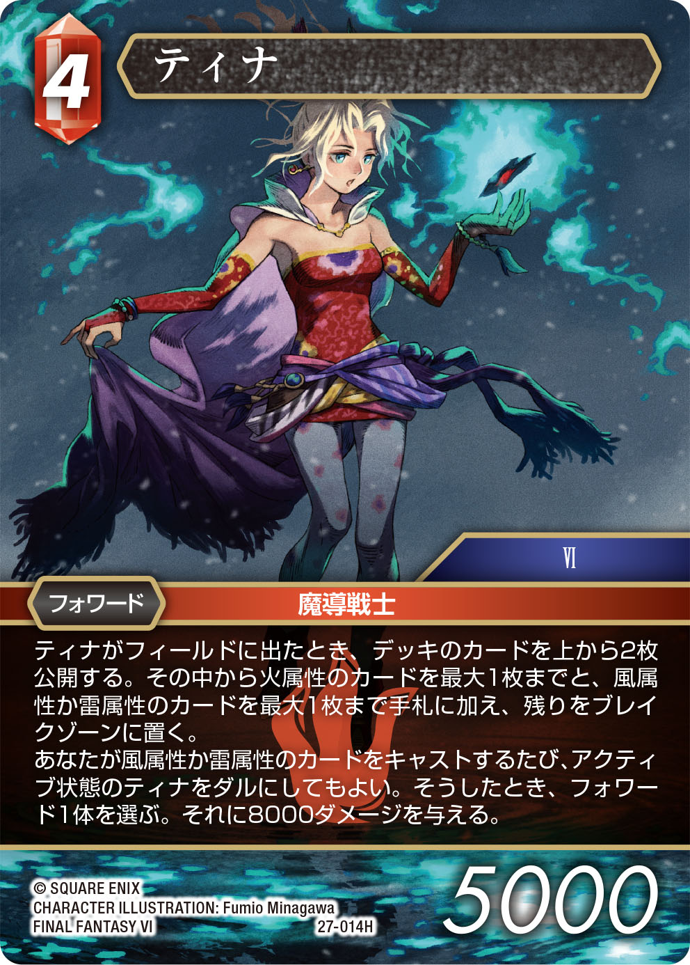 【27-014H】ティナはコスト4、パワー5000の火属性のフォワードで、フィールドに出たときのオートアビリティと、風属性か雷属性のカードをキャストすると発動するオートアビリティを持ちます。